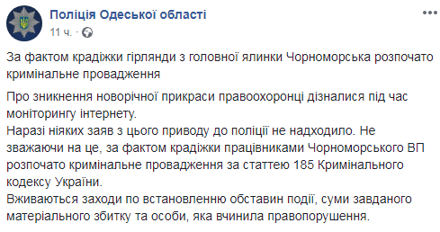 "Пока никаких заявлений по этому поводу в полицию не поступало. Несмотря на это, по факту кражи работниками Черноморского ОП начато уголовное производство по статье 185 Уголовного кодекса Украины", - указано в опубликованном сообщении.