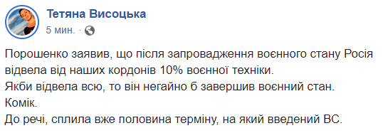 Кстати, прошла уже половина срока, на который введено ВП", - пишет журналистка Татьяна Высоцкая.