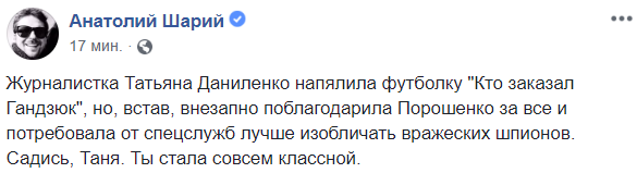 "Журналистка Татьяна Даниленко напялила футболку "Кто заказал Гандзюк", но, встав, внезапно поблагодарила Порошенко за все и потребовала от спецслужб лучше изобличать вражеских шпионов. Садись, Таня. Ты стала совсем классной", - блогер Анатолий Шарий.
