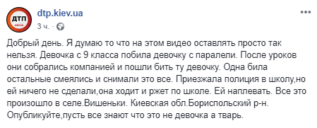 В сети появилось видео, на котором школьница в селе Вишеньки Бориспольского района Киевской области избивает ровесницу. Его обнародовало сообщество dtp.kiev.ua на странице в Facebook.