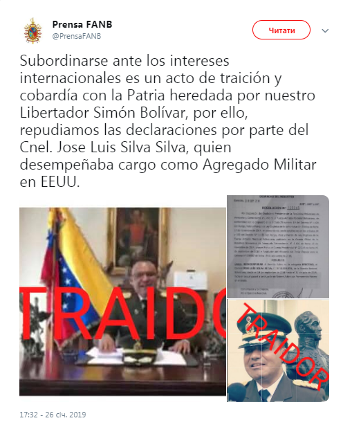 В то же время министерство обороны Венесуэлы назвало Хосе Луиса Сильву изменником. Это заявление опубликовано в официальном Twitter.