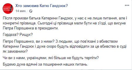 "После речи отца Екатерины Гандзюк, у нас есть не только вопросы, но и конкретные фамилии. Сегодня эти фамилии должны были быть на съезде, который выдвинет Петра Порошенко в президенты. Гордеев? Рыщук? Петр Порошенко, вы с ними? С людьми, которые связаны с убийством Екатерины Гандзюк и очень скоро будут отвечать за это убийство в суде как заказчики?", - сказано в заявлении.