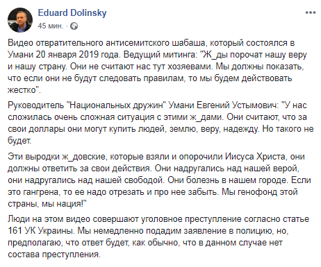 "Видео отвратительного антисемитского шабаша, который состоялся в Умани 20 января 2019 года. Ведущий митинга: "Ж@ды порочат нашу веру и нашу страну. Они не считают нас тут хозяевами. Мы должны показать, что если они не будут следовать правилам, то мы будем действовать жестко". Руководитель "Национальных дружин" Умани Евгений Устымович: "У нас сложилась очень сложная ситуация с этими ж@дами. Они считают, что за свои доллары они могут купить людей, землю, веру, надежду. Но такого не будет..."", - написал Долинский.