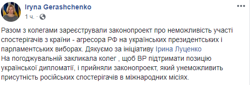 "Вместе с коллегами зарегистрировали законопроект о невозможности участия наблюдателей из страны - агрессора РФ на украинских президентских и парламентских выборах", - написала Ирина Геращенко. Она поблагодарила за инициативу представителя президента в парламенте, нардепа от БПП Ирину Луценко.