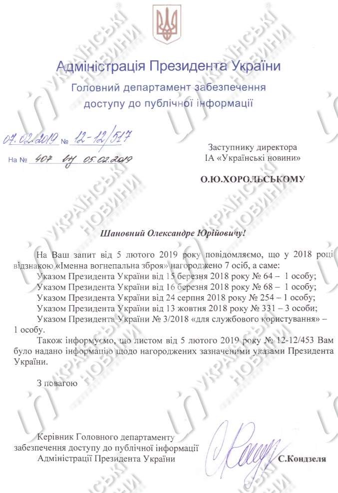 В течение 2018 президент Украины Петр Порошенко как государственную награду вручал боевое огнестрельное оружие семь раз. Об этом можно сделать вывод из ответа Администрации президента Украины, который на соответствующий информационный запрос получило агентство Украинские новости.