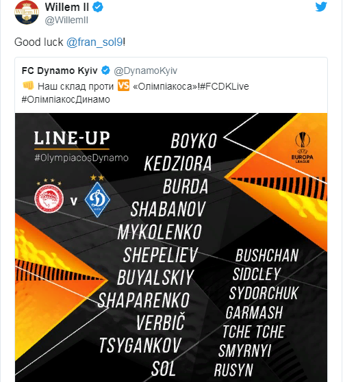 19:20 Голландская пресса отметила появления в стартовом составе "Динамо" новичка, экс-игрока голландского "Виллем ІІ" Фран Соля. В первой половине сезона он был лучшим бомбардиром нидерландской команды и там перед сегодняшнем матчем желают ему удачи.