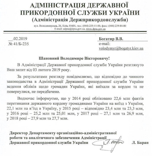 А примерно миллион двести тысяч украинцев со времен Майдана не вернулись в Украину. Об этом рассказал "Стране" адвокат Владимир Богатырь, который направил официальный запрос в Госпогранслужбу и недавно получил ответ.