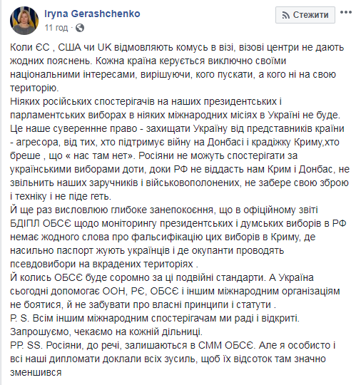 Первый вице-спикер Рады Ирина Геращенко вновь заявила о позиции Украины не допускать на выборы президента наблюдателей из России.