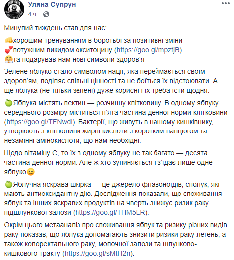 Глава Минздрава Ульяна Супрун призвала украинцев есть яблоки каждый день. Об этом она написала на своей странице в Facebook. Глава МОЗ рассказала о пользе яблок и, как их лучше употреблять.