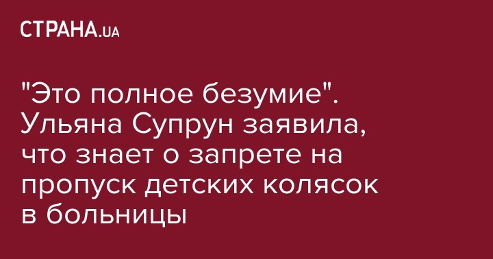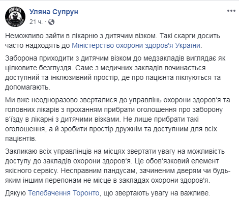 В ряде больниц Украины фактически невозможно зайти в помещение с детской коляской. Такие жалобы довольно часто поступают в Министерство здравоохранения Украины, об этом на своей Фейсбук-странице сообщила и.о. министра Ульяна Супрун.
