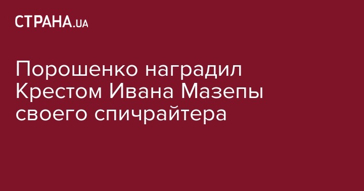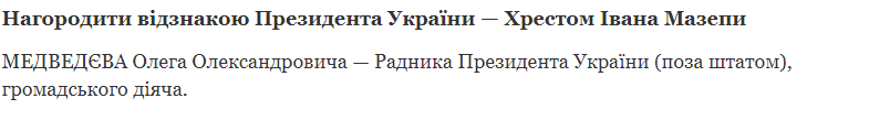 Президент Украины Петр Порошенко вручил своему внештатному советнику и спичрайтеру Олегу Медведеву Крест Ивана Мазепы. Соответствующий указ под номером 39 был опубликован 20 февраля на официальном сайте главы государства.