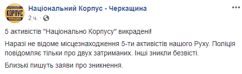 Национальный корпус заявляет об исчезновении их активистов в Черкассах. Об этом сказано на официальной странице националистов в Facebook.