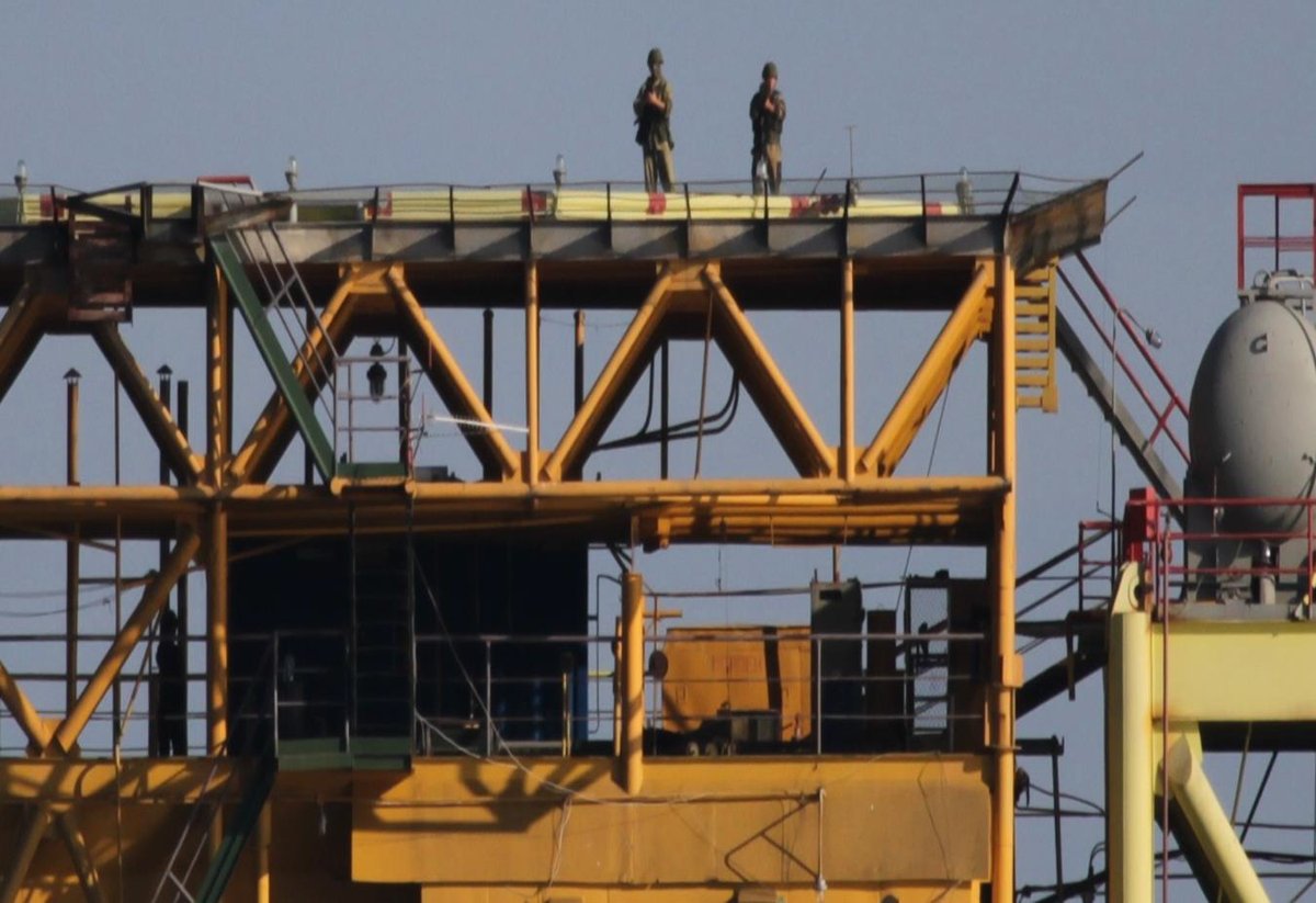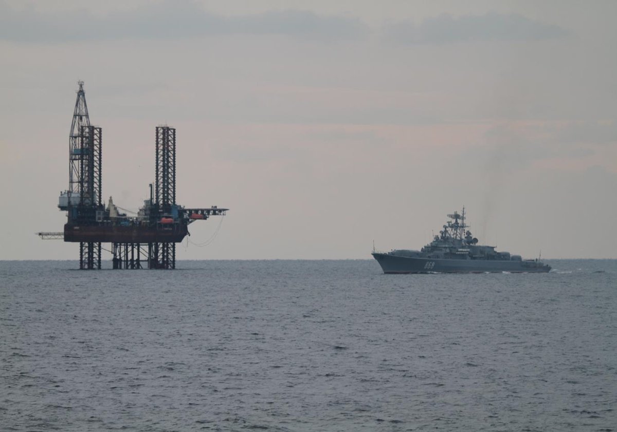 НАК "Нафтогаз Украины" опубликовал в своем Twitter снимки, на которых запечатлено, как российские военные корабли охраняют захваченные объекты компании.