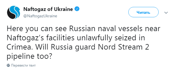 "Здесь вы можете увидеть российские военные корабли возле объектов "Нафтогаза", незаконно захваченных в Крыму. Будет ли Россия так же охранять газопровод "Северный поток-2", - сказано в подписи к фото.