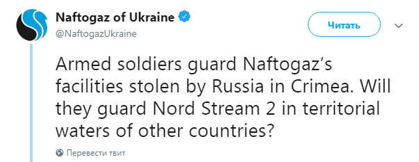 "Вооруженные солдаты охраняют объекты "Нафтогаза", похищенные Россией в Крыму. Будут ли они охранять "Северный поток-2" в территориальных водах других стран?", - спрашивают в компании.