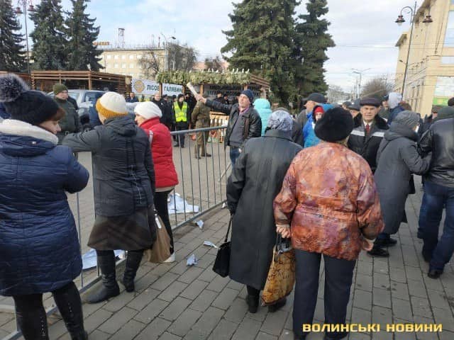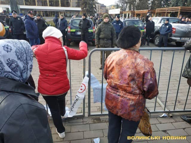15:28 Вся территория перед театром в Луцке огорожена забором, за которым стоит до сотни митингующих людей.