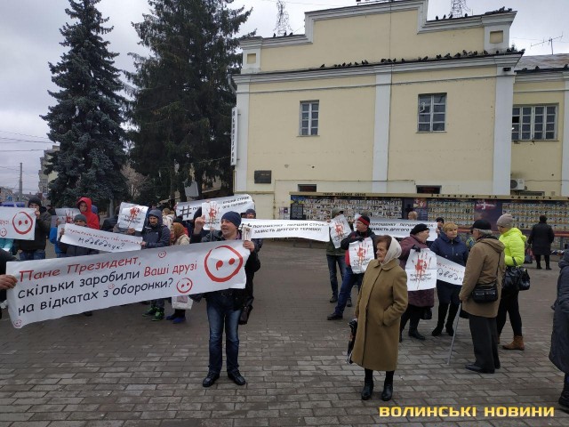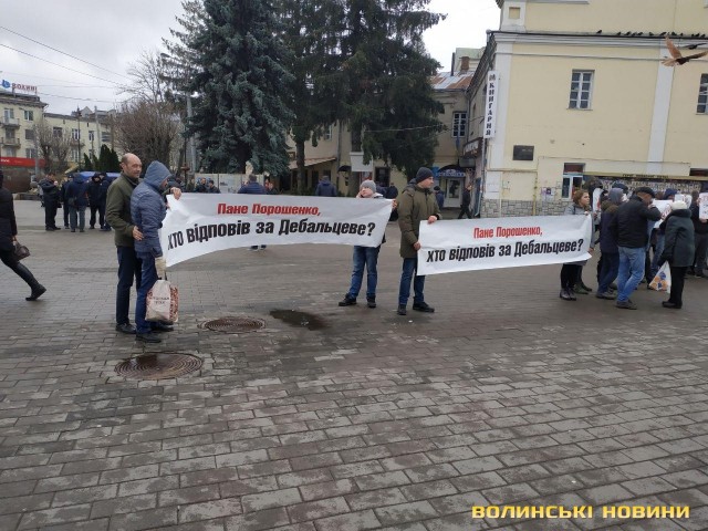14:40 В центре Луцка развернули плакаты с надписями "Кто ответил за Дебальцево?", "Господин президент, сколько заработали ваши друзья на откатах с оборонки?", "Порошенко, сколько тебе платит Медведчук?".