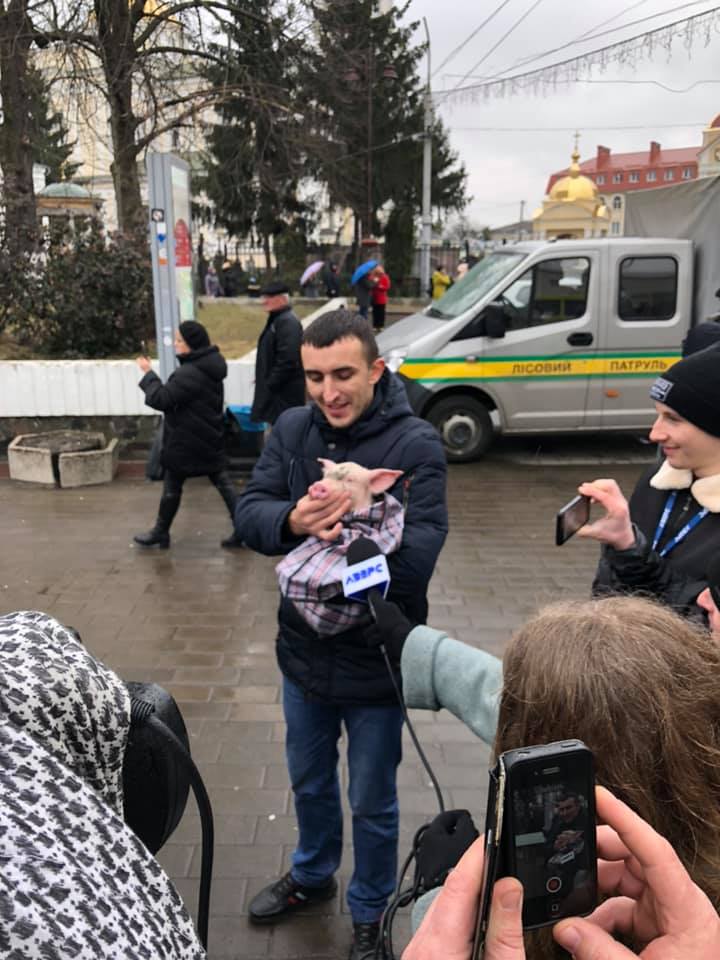 13:00 Житель Луцкого района Николай Гачевский привез на встречу с Порошенко поросенка - "маленького Свинарчука", которого он назвал Петей "в честь нашего гаранта".