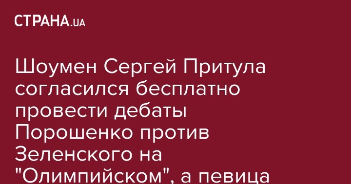 Украинский шоумен и телеведущий Сергей Притула заявил, что готов бесплатно провести возможные дебаты между кандидатами в президенты Петром Порошенко и Владимиром Зеленским в НСК "Олимпийский". Об этом он написал на своей странице в Facebook.