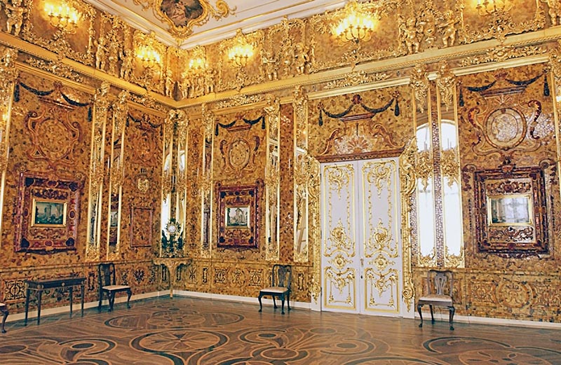 Знаменитая Янтарная комната была подарена царю Петру I прусским королем Вильгельмом I  в качестве дипломатического подарка в 1716 году. Ящики с янтарными панно были доставлены в Петербург, но при Петре кабинет так и не установили. Лишь дочь Петра Елизавета I вспомнила о подарке и поручила украсить этими панно Зимний дворец. К 1770 году комната переехала в Екатерининский дворец в Царском Селе.