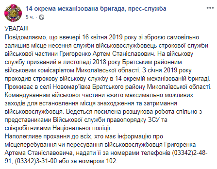"Вечером 16 апреля 2019 с оружием самовольно оставил место несения службы военнослужащий срочной службы воинской части Григоренко Артем Станиславович. На военную службу призван в ноябре 2018 Братским районным военным комиссариатом Николаевской области. С января 2019 проходил срочную военную службу в 14 отдельной механизированной бригаде. Живет в селе Новомарьевка Братского района Николаевской области", - сказано в сообщении.
