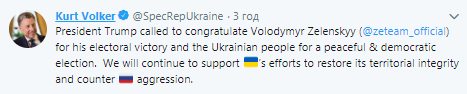 "Президент Трамп позвонил поздравить Владимира Зеленского с победой на выборах и украинский народ с мирными и демократическими выборами. Мы будем и дальше поддерживать усилия Украины в восстановлении территориальной целостности и отражения агрессии", - написал Волкер.