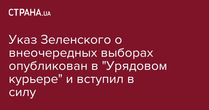 Сегодня утром, 23 мая, указ президента Украины Владимира Зеленского о досрочном прекращении полномочий Верховной Рады и назначении внеочередных выборов на 21 июля 2019 года опубликован в правительственном издании "Урядовый курьер".