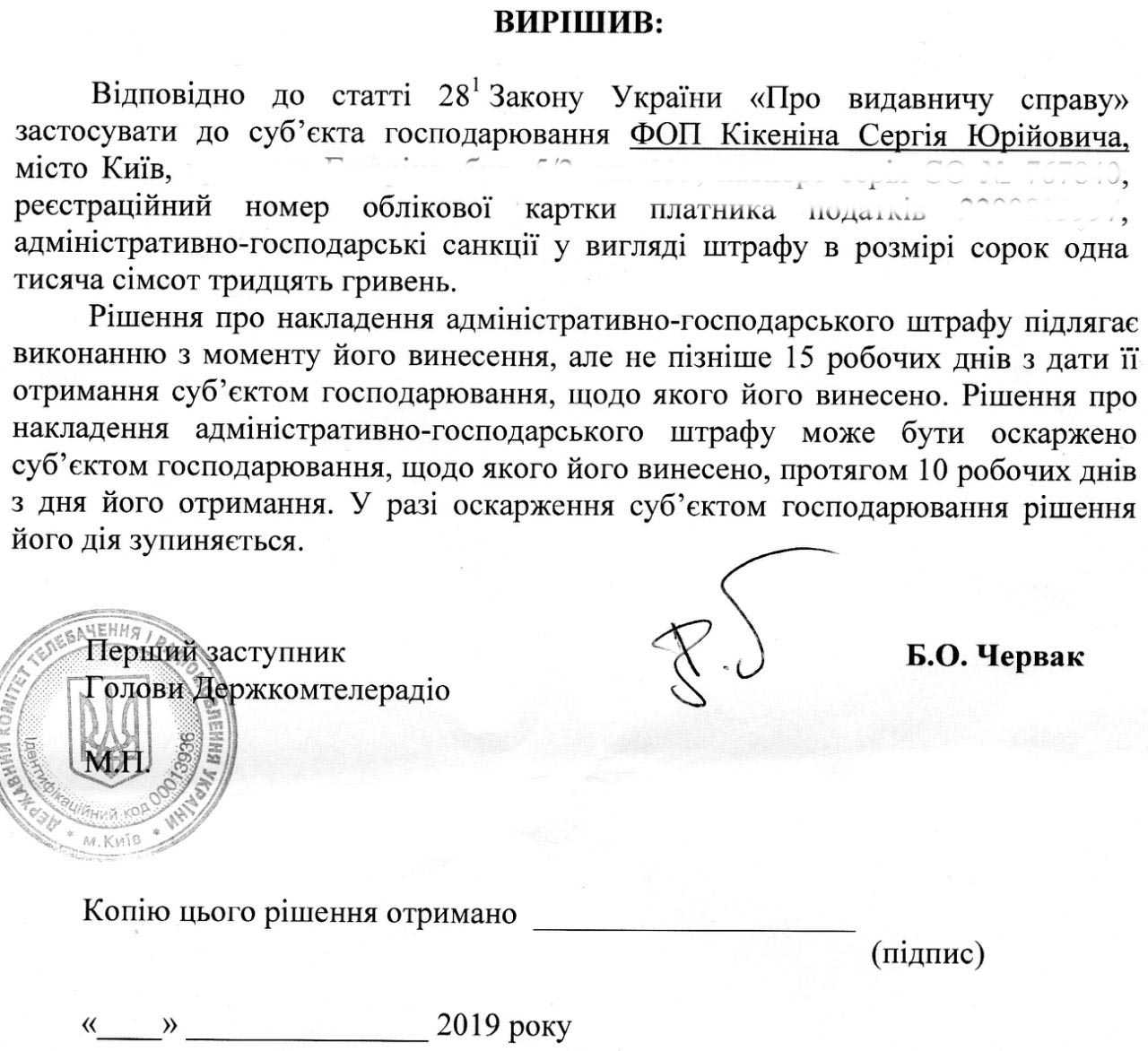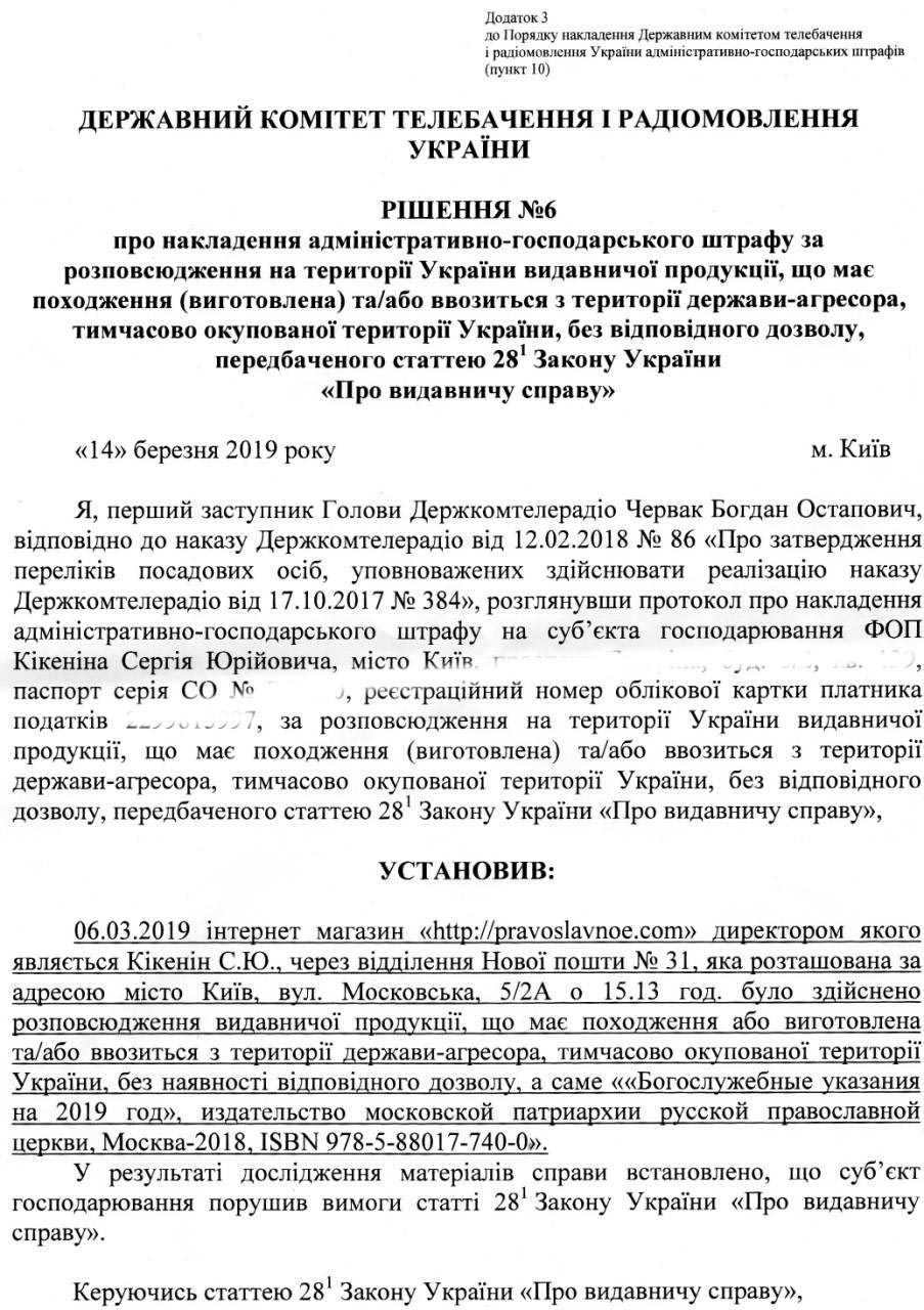 После беседы в СБУ Сергея Юрьевича вызвали в Госкомитет Украины по телевидению и радиовещанию, где первый замглавы комитета Богдан Червак (по совместительству действующий глава ОУН и Провода украинских националистов) подписал штраф в 10 необлагаемых минимумов – 41700 гривен. Официально – за нарушение статьи 28 (1) Закона Украины об издательском деле. Согласно данной статье, издательская продукция может быть ввезена "с территории государства-агрессора" и распространена на территории Украины только при условии наличия соответствующего разрешения центрального органа власти, отвечающего за информационную политику. Однако, по той же статье, не требуется такое разрешение для "издательской продукции, ввозимой гражданами в ручной клади или в багаже общим количеством не более 10 экземпляров".