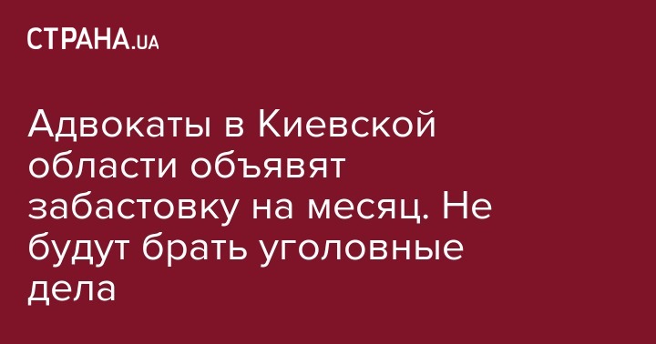 С 20 июня по 20 июля 2019 года все адвокаты Киевской области объявляют предупредительную забастовку, на время которой прекращают предоставление любой правовой помощи по уголовным производствам в полиции, прокуратуре, судах на территории Киевской области, кроме города Киев. Бесплатные адвокаты также не смогут оказывать помощь в уголовных процессах на территории Киевской области.