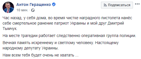 Буквально сразу после трагедии на Тымчука, который много лет работал военным журналистом, был в Ираке и Ливане, и, собственно, на фронтах нашей Национально-освободительной войны, Антон Геращенко пытался повесить "неосторожное обращение с оружием", и это при том, опять же, что Тымчук был подполковником ГУР МОУ, а значит ТОЧНО знал, как вести себя с огнестрелом.