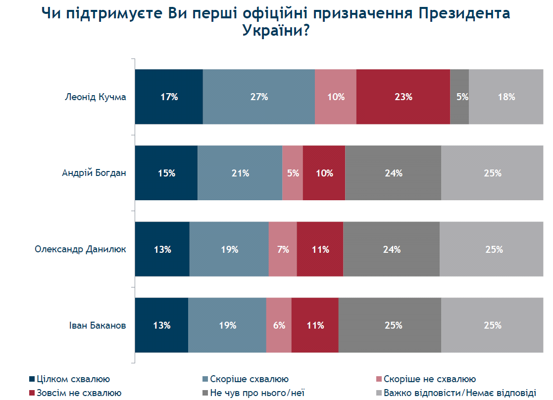 Наибольшее неприятие вызвало, как ни странно, тоже назначение Кучмы. Его скорее или совсем не поддерживают 33% опрошенных. У назначения главой Офиса президента Андрея Богдана  самый низкий антирейтинг - всего 15%.