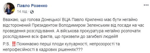 "Считаю, что председатель Донецкой ВГА Павел Кириленко должен быть немедленно отстранен президентом Владимиром Зеленским от должности на время проведения расследования. А военная прокуратура должна немедленно начать расследование всех фактов, которые привели к гибели людей. Пожинаем первые плоды кулуарности, непрозрачности и непрофессионализма в кадровых решениях?", - написал Розенко.