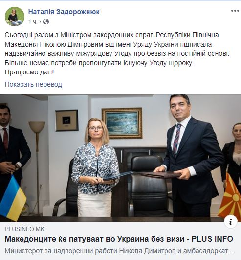 Посол Украины в Северной Македонии Наталья Задорожнюк подписала с министром иностранных дел Северной Македонии Николой Димитровым соглашение о безвизовом режиме между двумя странами, которое будет действовать на постоянной основе. Об этом посол сообщила на своей странице в Facebook.