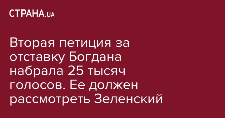 Между тем, другая петиция, зарегистрированная тем же днем, 23 мая, с тем же требованием - отставки Богдана - уже набирала достаточное количество голосов.