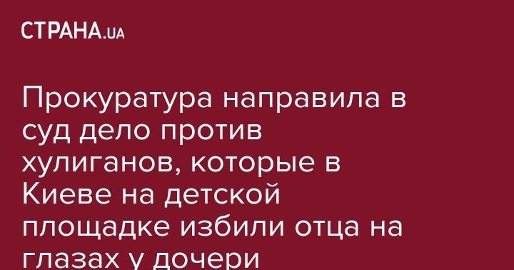 Прокуратура направила в суд обвинение в отношении четырех молодых людей, которые в конце мая устроили драку на детской площадке в Киеве и избили мужчину, гулявшего там с ребенком. Об этом сообщает пресс-служба Прокуратуры Киева.
