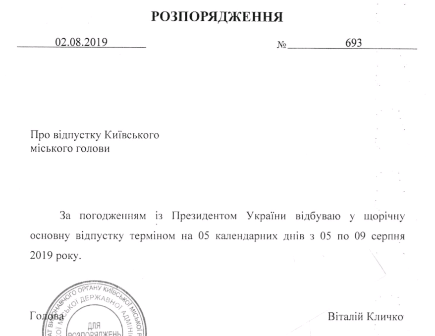 Кличко уведомил, что в отпуске он будет всего 5 дней: с 5 по 9 августа. Как сказано в распоряжении, отдых мэра от трудов согласован с президентом Украины Владимиром Зеленским.