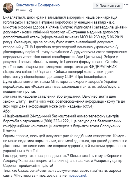 В понедельник, 5 августа, исполняющая обязанности министра здравоохранения Ульяна Супрун подписала и утвердила новый клинический протокол "Экстренная медицинская помощь: догоспитальный этап", который был скопирован из аналогичного документа в США, после чего переведен на украинский язык.