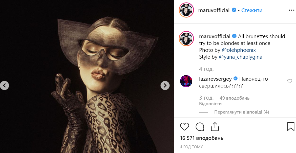 Украинская певица Maruv, которая выиграла отбор на Евровидение-2019, но все равно не попала на конкурс, опубликовала в соцсети фото, на которых она запечатлена в кошачьем образе.