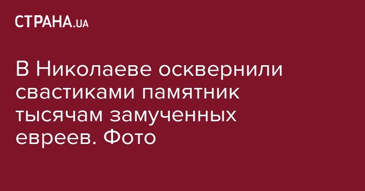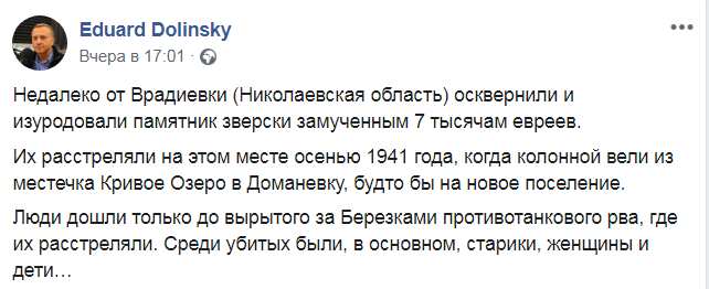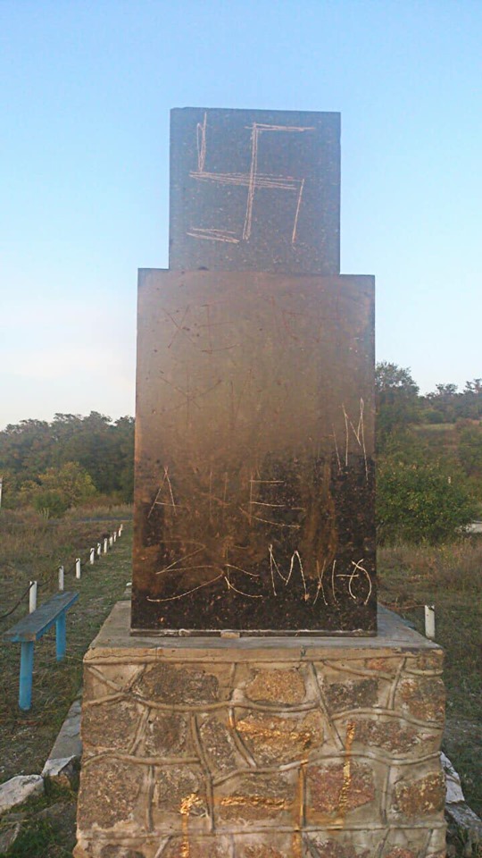 Недалеко от пгт Врадиевка Николаевской области неизвестные нарисовали нацистский символ и оставили оскорбительные надписи на памятнике жертвам Холокоста. Об этом на своем Facebook сообщает директор Украинского еврейского комитета Эдуард Долинский.