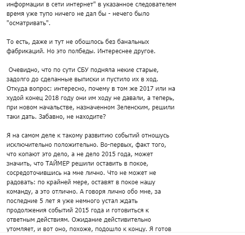 "Во-первых, факт того, что копают это дело, а не дело 2015 года, может значить, что Таймер решили оставить в покое, сосредоточившись на мне лично. Что не может не радовать: по крайней мере, оставят в покое нашу команду, а это отлично. А говоря лично обо мне, за последние 5 лет я уже немного устал ждать продолжения событий 2015 года и готовиться к ответным действиям. Ожидание дейстивительно утомляет, и вот оно, похоже, подошло к концу. Я готов дать СБУ интеллектуальный бой в зале суда, и намерен использовать потенциал скамьи подсудимых по политическому делу в качестве трибуны на 100%", - написал Ткачев.