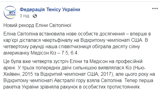 Это была уже четвертая встреча Элины и Мэдисон на профессиональной арене. В трех предыдущих дважды сильнее оказывалась Киз (Нью-Хейвен, 2015 и Открытый чемпионат США, 2017), но в этом году на Открытом чемпионате Австралии верх взяла Свитолина. Теперь первая ракетка Украины сравняла счет в личных противостояниях", - уточнили в пресс-службе Федерации.