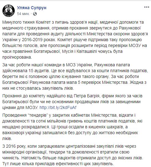 Супрун добавила, что комитету предлагали расширить период проверки Минздрава на время правления Богатыревой, Мусия и Квиташвили, но это депутаты проигнорировали.