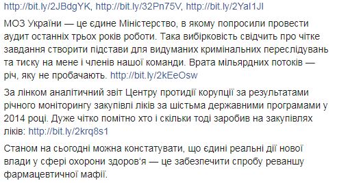 Экс-руководительница МОЗ добавила, что за время ее руководства министерством больше пациентов получили доступ к качественным лекарствам. Она также дала ссылку на аналитический отчет Центра противодействия коррупции, который промониторил закупки лекарств по шести государственным программам в 2014 году, и в котором "заметно кто и сколько тогда заработал на закупках".