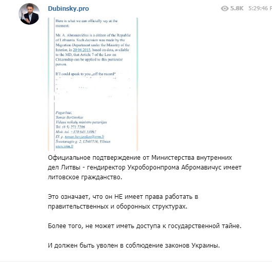 "Это означает, что он НЕ имеет права работать в правительственных и оборонных структурах. Более того, не может иметь доступа к государственной тайне. И должен быть уволен в соблюдение законов Украины", - написал в соцсети Дубинский.