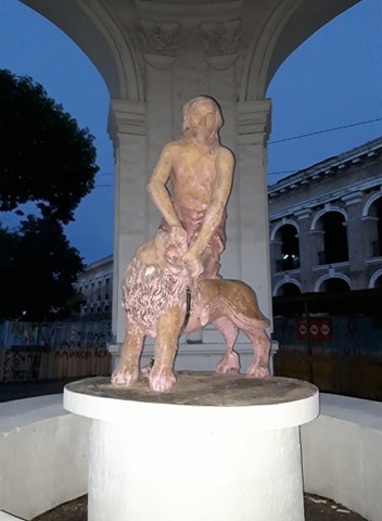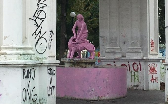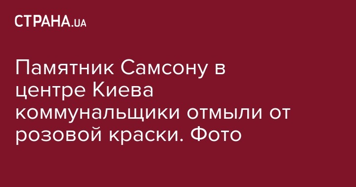 Сотрудники коммунального предприятия по содержанию зеленых насаждений  отмыли скульптуру-фонтан Самсона на столичном Подоле, которую вандалы покрасили в розовый цвет, сообщает Сегодня.