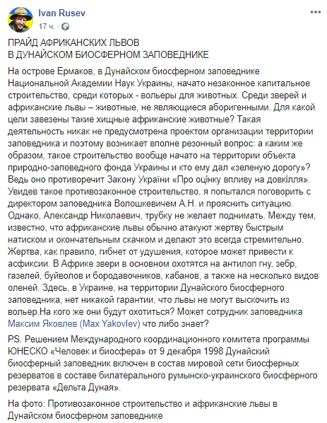 "На острове Ермаков, в Дунайском биосферном заповеднике Национальной академии наук Украины, начато незаконное капитальное строительство. В том числе, вольеры для прайда африканских львов - животных, не являющихся аборигенными. С какой целью завезены хищные африканские звери? Ведь такая деятельность не предусмотрена проектом организации территории заповедника, поэтому возникает резонный вопрос: а каким образом начато масштабное строительство на территории объекта природно-заповедного фонда Украины? Кто ему дал "зеленую дорогу" вопреки требованиям Закона Украини "Об оценке влияния на окружающую среду", - пишет Русев.