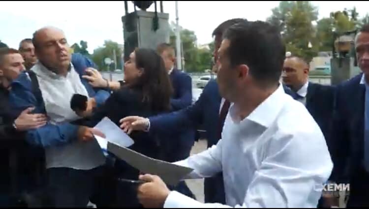 Журналист проекта "Схемы" Радио Свобода Михаил Ткач в Facebook прикрепил скрины видео, на которых видно, что пресс-секретарь Юлия Мендель грубо отталкивает журналиста от Владимира Зеленского и Андрея Богдана.
