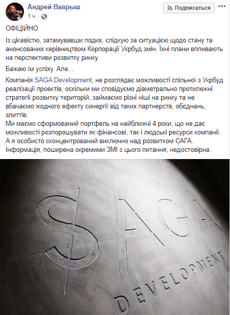 "Компания Saga Development не рассматривает возможности совместной с "Укрбуд" реализации проектов, поскольку мы исповедуем диаметрально противоположные стратегии развития территорий, занимаем разные ниши на рынке и не видим никакого эффекта синергии от таких партнерств, объединений, слияний", - написал Вавриш.