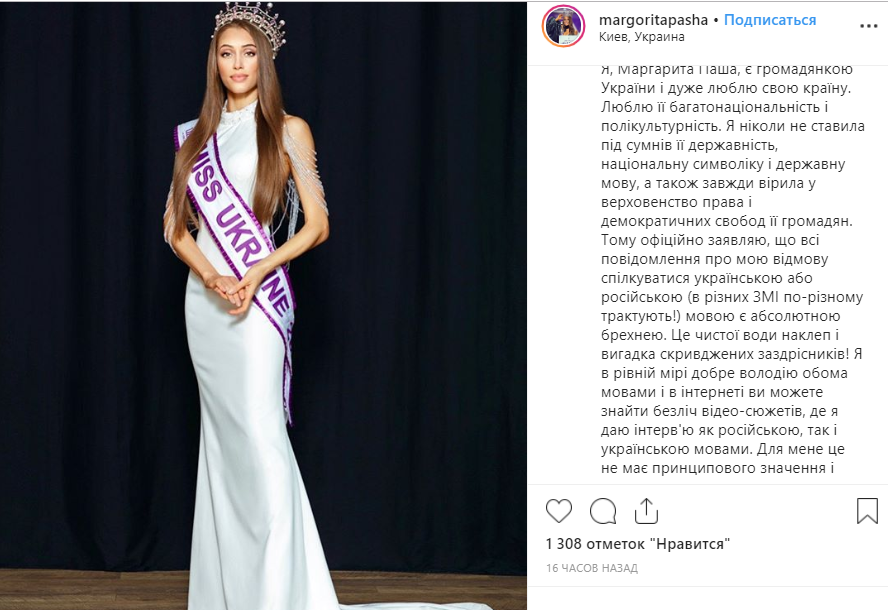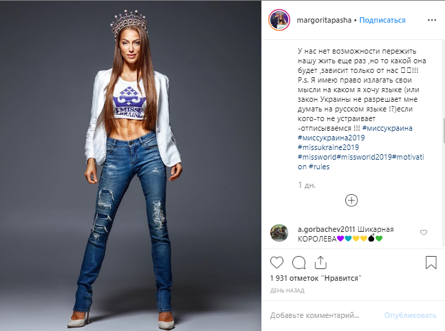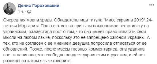 "Очередная мовна зрада: Обладательница титула "Мисс Украина 2019" 24-летняя Маргарита Паша в ответ на призывы поклонников вести инсту на украинском, разместила пост о том, что она имеет право излагать свои мысли на любом языке, поскольку это не запрещено законом Украины. А тех, кто не согласен с ее мнением девушка попросила отписаться от ее обновлений. Позже, после массы гневных комментариев, она удалила пост и написала, что свободно владеет украинским и русским, и ей нет разницы на каком языке говорить" - пишет блогер Денис Гороховский.