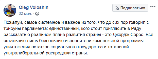 "Из нас многие тут обижаются, почему к нам не приходит премьер-министр, министр иностранных дел или не отчитывается президент. А зачем? Единственный человек, которого стоит пригласить и который действительно может пояснить, что происходит в экономико-фискальной политике Украины и со всеми этими решениями, является господин Джордж Сорос. Я предлагаю всем вместе пригласить этого человека (или если он сам не может, пускай пришлет уполномоченного представителя). Пусть он пояснит, зачем мы голосуем, уничтожая остатки социального государства в Украине и отдавая ее на растерзание транснациональным корпорациям, которые, используя популярного и близкого к народу господина Зеленского, хотят установить тут свою диктатуру", - сказал Волошин.